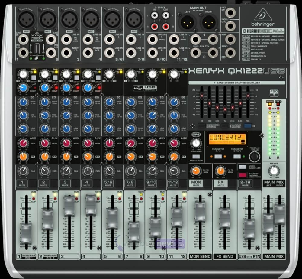 Behringer QX1222USB Mezclador Premium De 16 Entradas 2/2 Buses. El mezclador compacto XENYX QX1222USB le permite lograr sin esfuerzo un sonido de primera calidad. Los canales 1 a 4 cuentan con nuestros preamplificadores de micrófono XENYX, reconocidos por su rendimiento prístino, además de que 2 de los 4 canales estéreo aceptan entradas XLR, así como fuentes de nivel de línea.