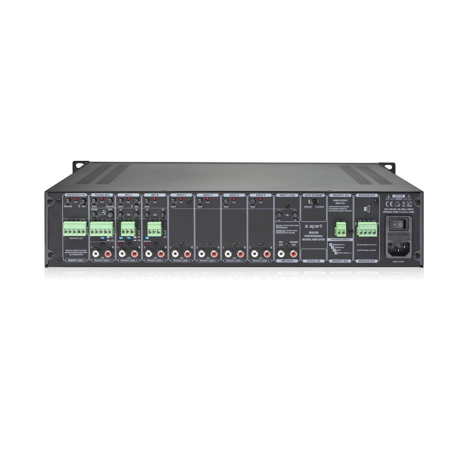 ofrece 240 vatios en modo de 70 o 100 voltios y viene con 2 entradas de micrófono / línea y 4 entradas mono sumadas de línea estéreo. En la parte trasera puede encontrar un sistema inteligente de prioridad de 4 niveles de izquierda a derecha para enrutamiento de audio, una entrada de emergencia, micrófono de paginación con timbre y una salida de anulación de 24 VCC. El MA240 tiene una interfaz intuitiva y fácil de usar invisible y un panel trasero lógico innovador. Instalar u operar este amplificador es un verdadero placer para todos los instaladores y usuarios finales en todo el mundo.