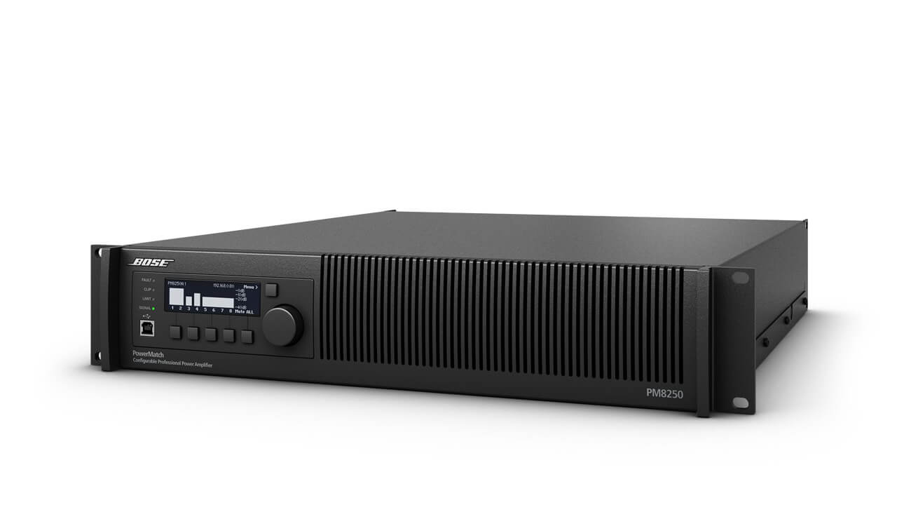El amplificador de potencia profesional configurable Bose® PowerMatch PM8250 proporciona sonido con calidad de concierto con un alto nivel de escalabilidad y configurabilidad para sistemas de refuerzo de sonido de instalación fija. Las versiones equipadas con Ethernet permiten la configuración, el control y el monitoreo de la red, y una ranura de expansión admite la entrada desde tarjetas de accesorios de audio digital opcionales. Los amplificadores PowerMatch utilizan numerosas tecnologías Bose para ofrecer una combinación sin precedentes de rendimiento, eficiencia y facilidad de instalación, todo en un diseño confiable y exclusivo.
