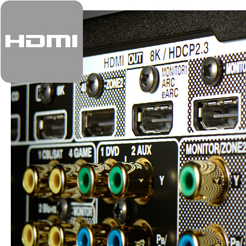 Receptor de AV 8K de 9.2 canales con 105W por canal que es totalmente compatible con formatos de audio 3D como Dolby Atmos®, Dolby Atmos Height Virtualization Technology, DTS: X®, DTS Virtual: X ™ e IMAX® Enhanced, así como las últimas especificaciones HDMI como 8K / 60Hz, 4K / 120Hz pass-through, VRR, ALLM, Dynamic HDR, HDR10 + y compatibilidad con eARC.