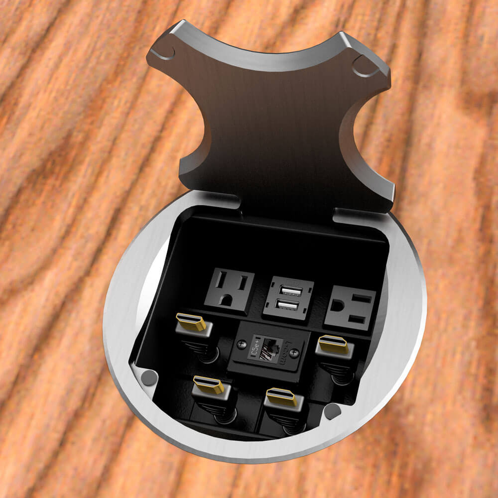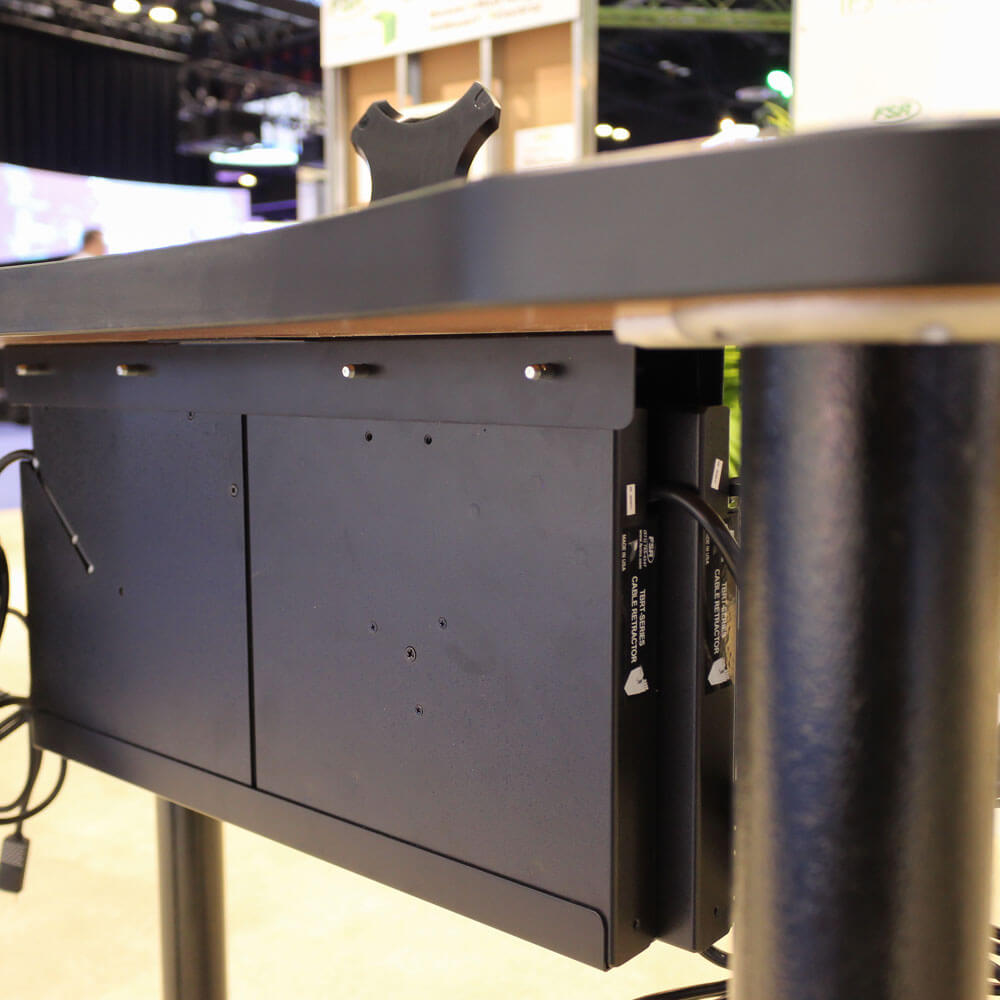 El LP-T6 es una versión de "bajo perfil" que ahorra espacio de la premiada serie de cajas de mesa T6 de FSR. Permite el uso de hasta cuatro conjuntos de retractores LP. Los retractores LP de estilo más corto se apilan de manera paralela y son paralelos al borde de la mesa para maximizar el espacio libre debajo de la mesa y brindar al usuario espacio adicional para las piernas mientras está sentado.
