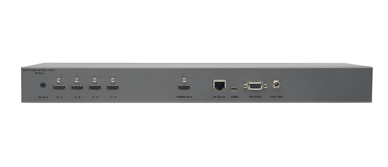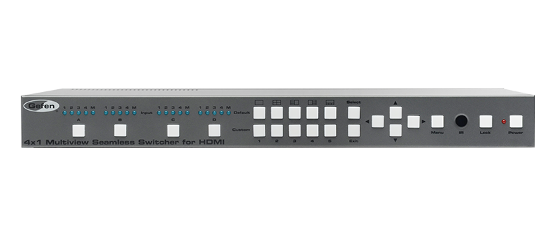 Audio from any of the four HDMI sources can be selected for playback via IR, RS-232, or IP. Five default factory presets provide most commonly used arrangements of windows on a display, including single window output. Five additional preset buttons allow the user to store and recall custom-configured window arrangements. All ten presets, source selection, Power on, Lock, and menu navigation control buttons are accessible via front panel and the handheld IR remote control, as well as RS-232 and IP (web server interface, Telnet, and UDP). An intuitive on-screen Graphical User Interface simplifies system configuration. The Gefen Multiview Seamless Switcher is a great solution for small and large commercial venues that require content from multiple entertainment and signage sources simultaneously displayed on a single display.