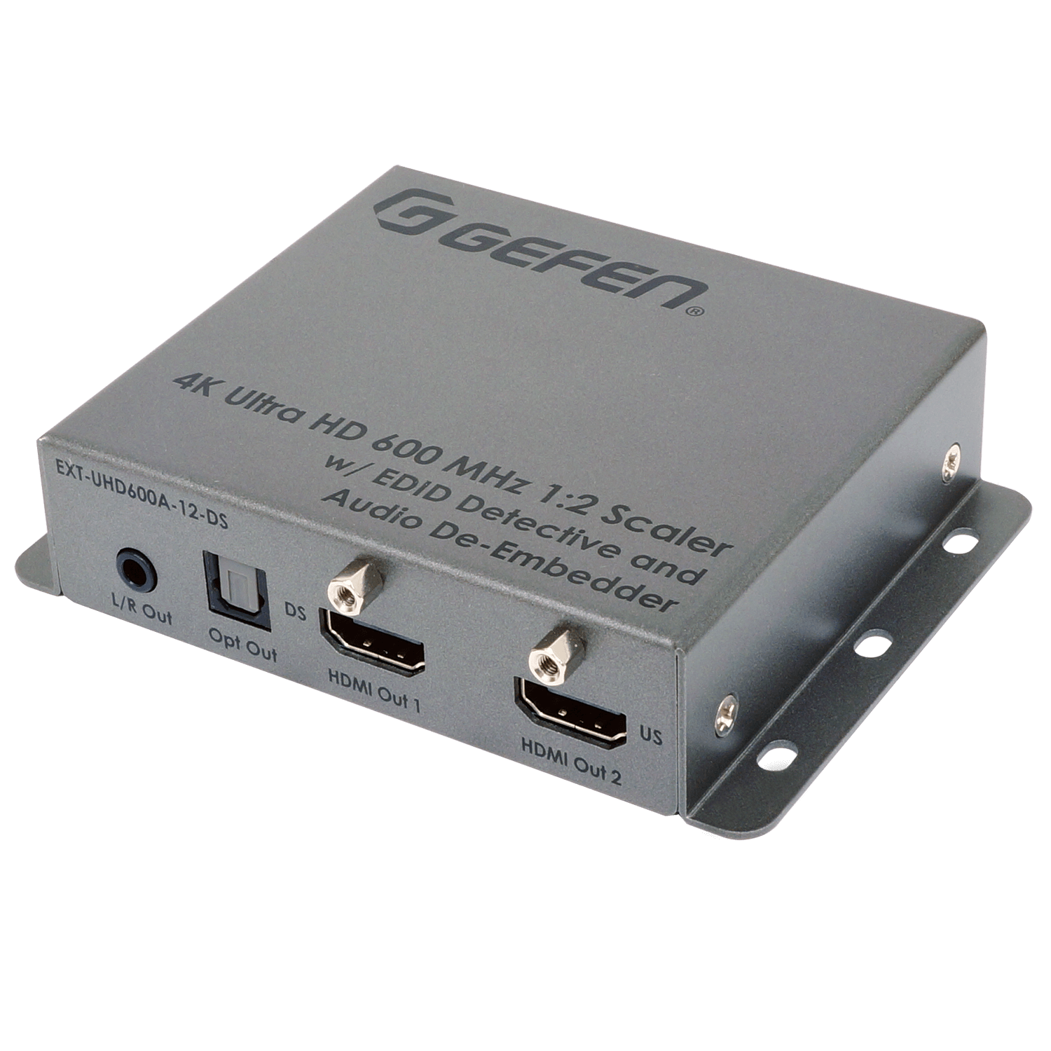 El Gefen EXT-UHD600A-12-DS es una solución compacta y potente para dividir audio / video HDMI 2.0 de ancho de banda completo con HDR para usar con pantallas 4K 600 MHz y 1080p Full HD simultáneamente, gracias a sus dos escaladores configurables. Admite 18.2 Gbps de rendimiento de datos y 600 MHz de frecuencia de reloj TMDS, la más alta especificada bajo el estándar HDMI 2.0. El desensamblador de audio L / R óptico digital y analógico TOSLINK® incorporado y un Detective EDID potente y versátil facilitan el uso de amplificadores de audio externos y garantizan la compatibilidad con una amplia gama de fuentes y pantallas.