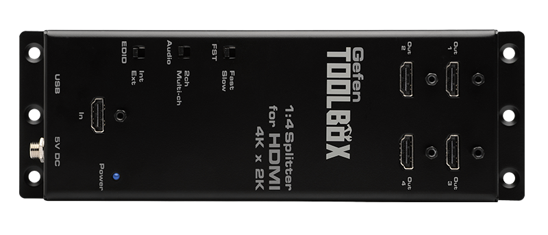 The GefenToolBox 1:4 Splitter for HDMI 4K x 2K distributes one Ultra Hi-Def A/V source to four Ultra HD displays simultaneously, without loss of qualityresolution. This product works with any Ultra Hi-Def source and supports resolutions up to 4K (3840 x 2160 @ 60Hz 4:2:0) and 4K Cinema (DCI) (4096 x 2160 @ 2430Hz 4:4:4).It features Fast Switching Technology, and supports HDCP, Deep Color, 3DTV pass-through, and lossless audio formats such as Dolby® TrueHD and DTS-HD Master Audio™.