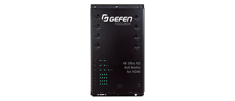 The GefenToolBox 4x4 Matrix for HDMI 4K x 2K is a compact and lightweight alternative to rack-mounted matrixes. It allows up to four Ultra High Definition 4K or 1080p Full HD sources to be routed to up to four Ultra HD displays. This product supports resolutions up to 4K (3840 x 2160 @ 60Hz 4:2:0 or 30Hz 4:4:4) and 4K Cinema (DCI) (4096 x 2160 @ 24 or 30Hz 4:4:4). Deep Color, 3DTV pass-through, and lossless audio formats such as LPCM 7.1, Dolby® TrueHD, and DTS-HD Master Audio™ are also supported. Each Ultra Hi-Def source can be routed to any of the connected displays using the front panel push-button controls, the included IR remote, RS-232 serial control interface, or through IP, using Telnet, UDP, and the built-in web server interface. LED indicators on the top panel display the current routing status, FST mode, audio configuration, and EDID settings.