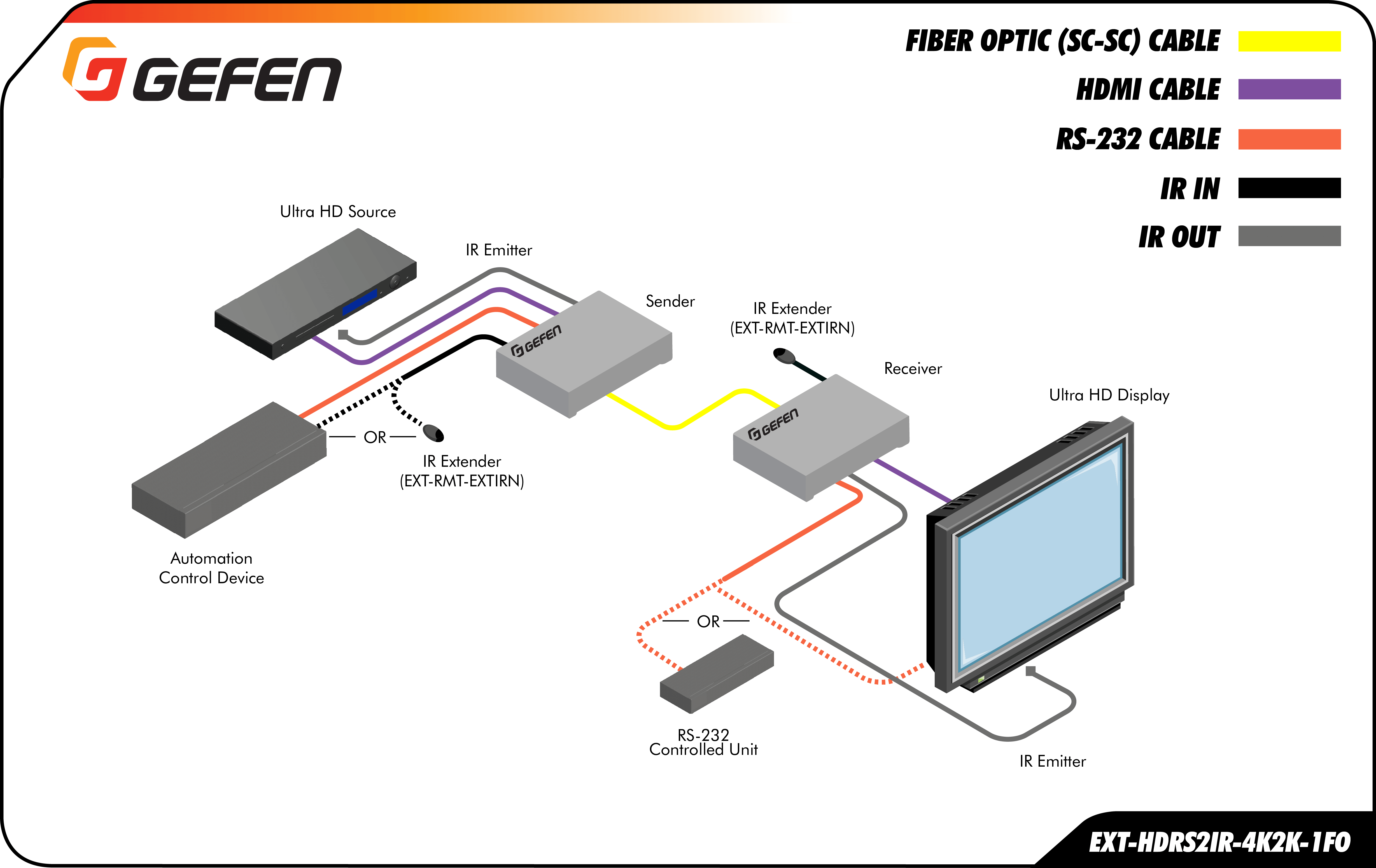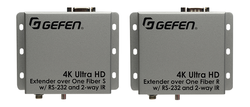 The Gefen 4K Ultra HD Extender for HDMI over One Fiber is a complete solution, allowing HDMI, RS-232 and Bi-Directional IR to be extended up to 3300 feet (1000 meters) at 4K resolution and up to 6600 feet (2000 meters) at 1080p60 Full HD. This product works with any HDMI source and supports resolutions up to 4K Ultra HD (3840 x 2160 @ 30Hz). This HDCP-compliant extender is the ideal for an installation where the HDMI source and display are located apart from each other in an interference-prone operating environment. A single strand of SC-terminated multi-mode fiber optic cable is used for extension, providing excellent protection from electromagnetic interference (EMI), and preserving signal integrity. The Automatic Virtual EDID feature allows automatic copying of the Extended Display Identification Data (EDID) to the sender unit for continuous availability to the source. This allows rapid recovery of picture upon display power up or when used in conjunction with Switchers and Matrixes. Compared to similar copper-based solutions, optical signal transmission provides inherent galvanic isolation and excellent immunity to electromagnetic interference. These Sender and Receiver modules also feature metal enclosures, providing further protection against radiated noise. Locking HDMI and power connectors ensure trouble-free installation and long-lasting, reliable operation.
