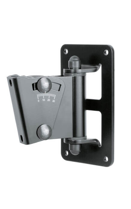 Herraje para montar altavoces en pared, permite la rotación lateral e inclinación vertical de hasta 30º del altavoz montado. El altavoz se monta facilmente al engancharse a la base y se asegura con un tornillo. Capacidad de carga de 15 Kg. Modelo en color negro.