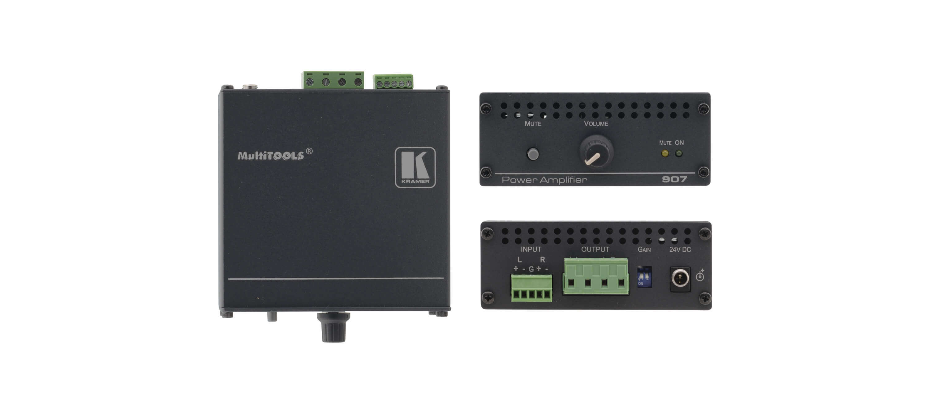 El 907 es un amplificador de potencia de alto rendimiento para señales de audio estéreo de nivel de línea. Acepta una señal de audio estéreo balanceada en un conector de bloque de terminales y entrega 40 vatios por canal en una carga de 8Ω.