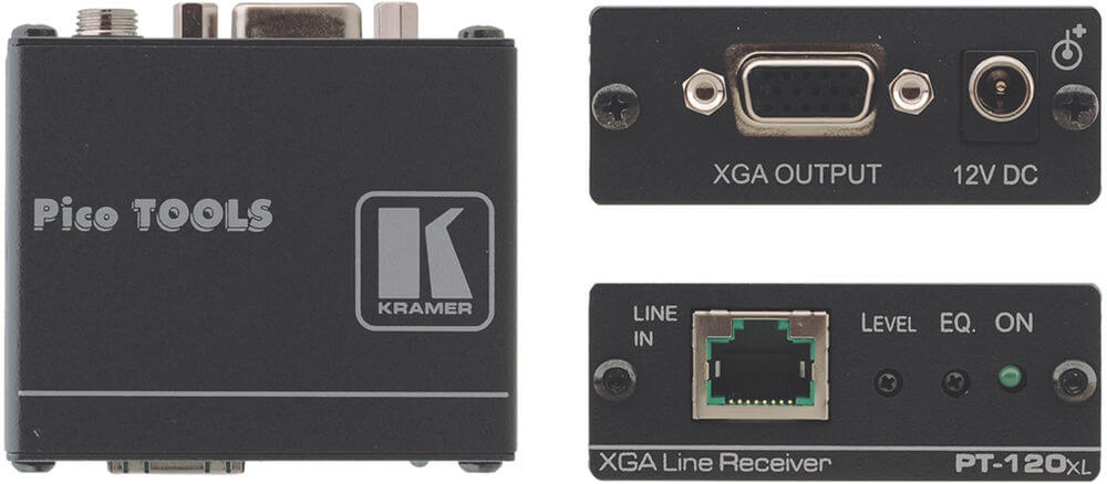 El PT−120xl es un receptor sobre par trenzado con el rango ampliado para señales gráficas de vídeo por ordenador. Convierte una señal de par trenzado desde un WP−110 ( u otro transmisor Kramer compatible) a una señal gráfica de ordenador.
