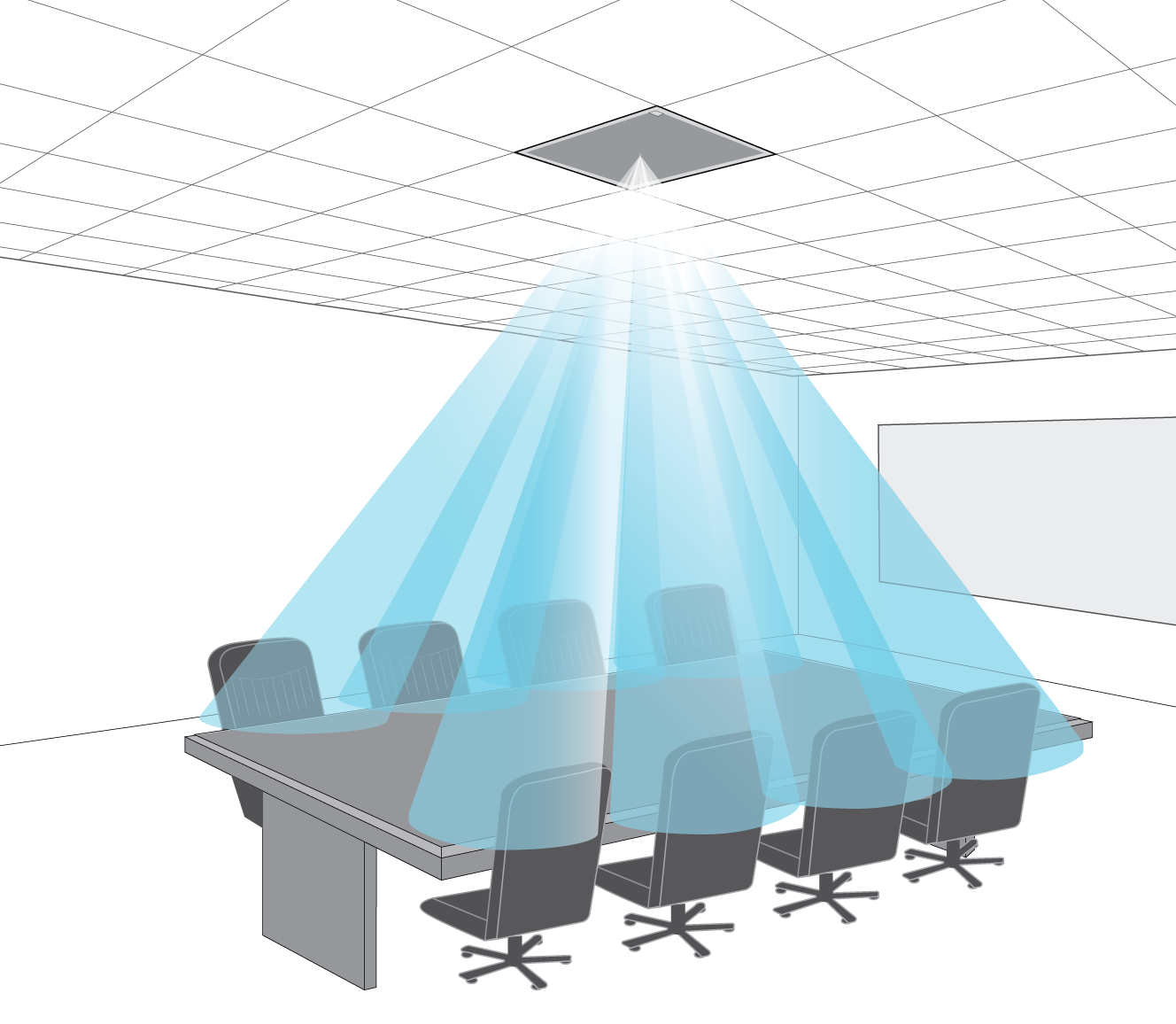 Arreglo de micrófono de techo con cobertura orientable de hasta 8 lóbulos separados para captar fuentes de sonido desde arriba con más precisión que cualquier otro producto.