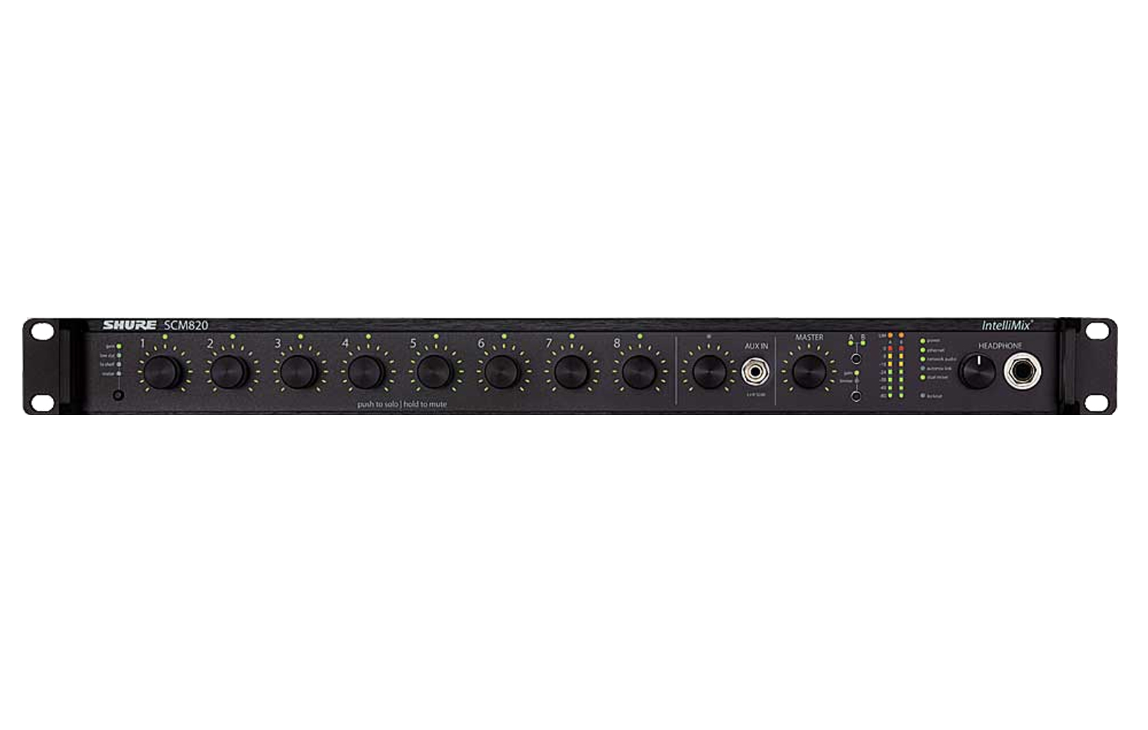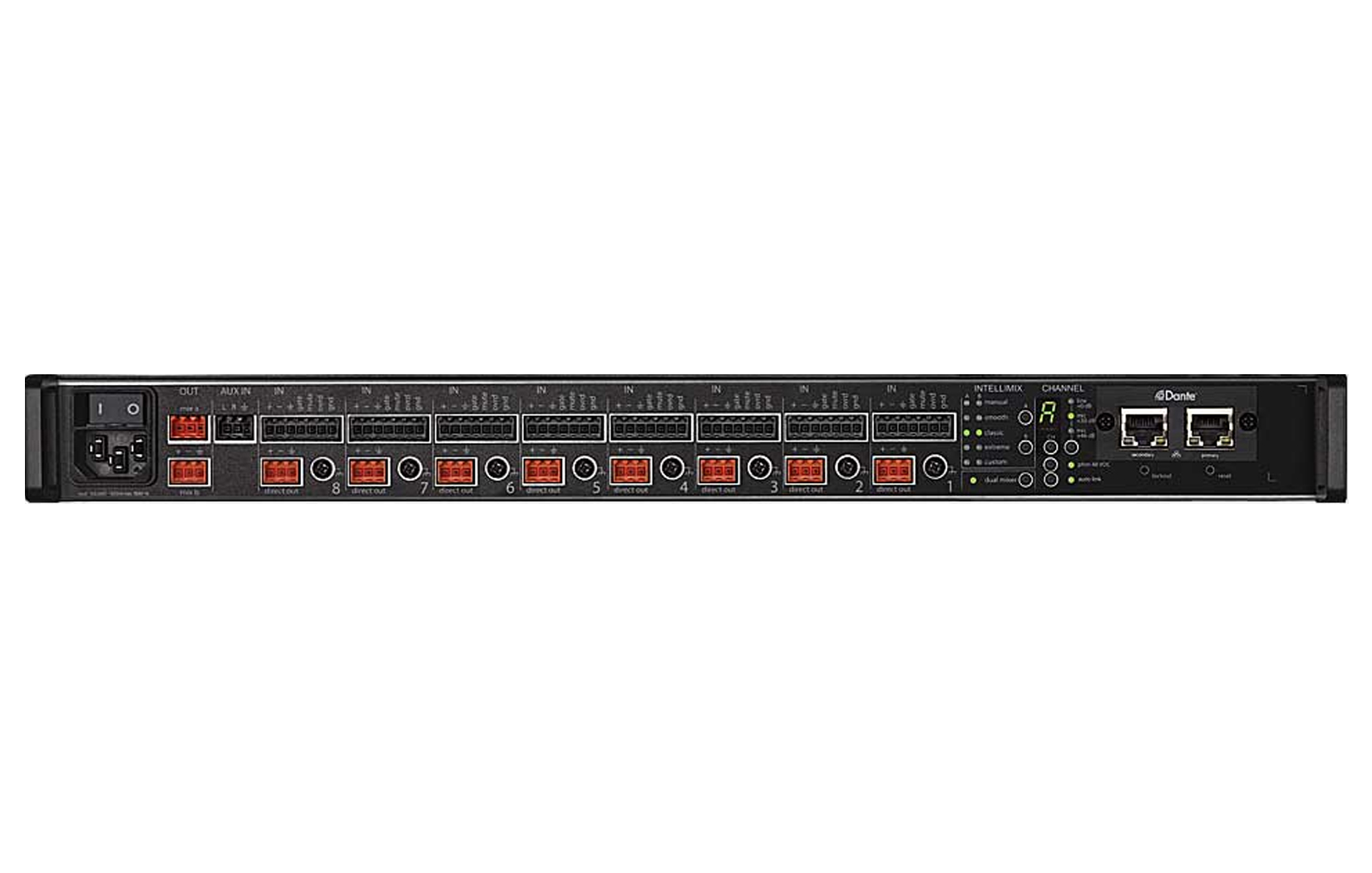 Mezcladora digital automática con salida digital DANTE, 8 canales de MIC/LINE, Phantom Power +48V, tecnología Intelimix (3 modos seleccionables por el usuario) y entrada/salida digital en formato Dante. Adicional, cuenta con 1 entrada auxiliar en 3.5mm, 8 salidas directas y 2 salidas principales (configurables como espejo o independientes). El conector de las entradas/salidas es en euroblock (Phoenix). Cuenta con entradas/salidas de lógica. Se pueden conectar hasta 12 mezcladoras usando el protocolo Dante para crear un sistema de hasta 96 micrófonos.