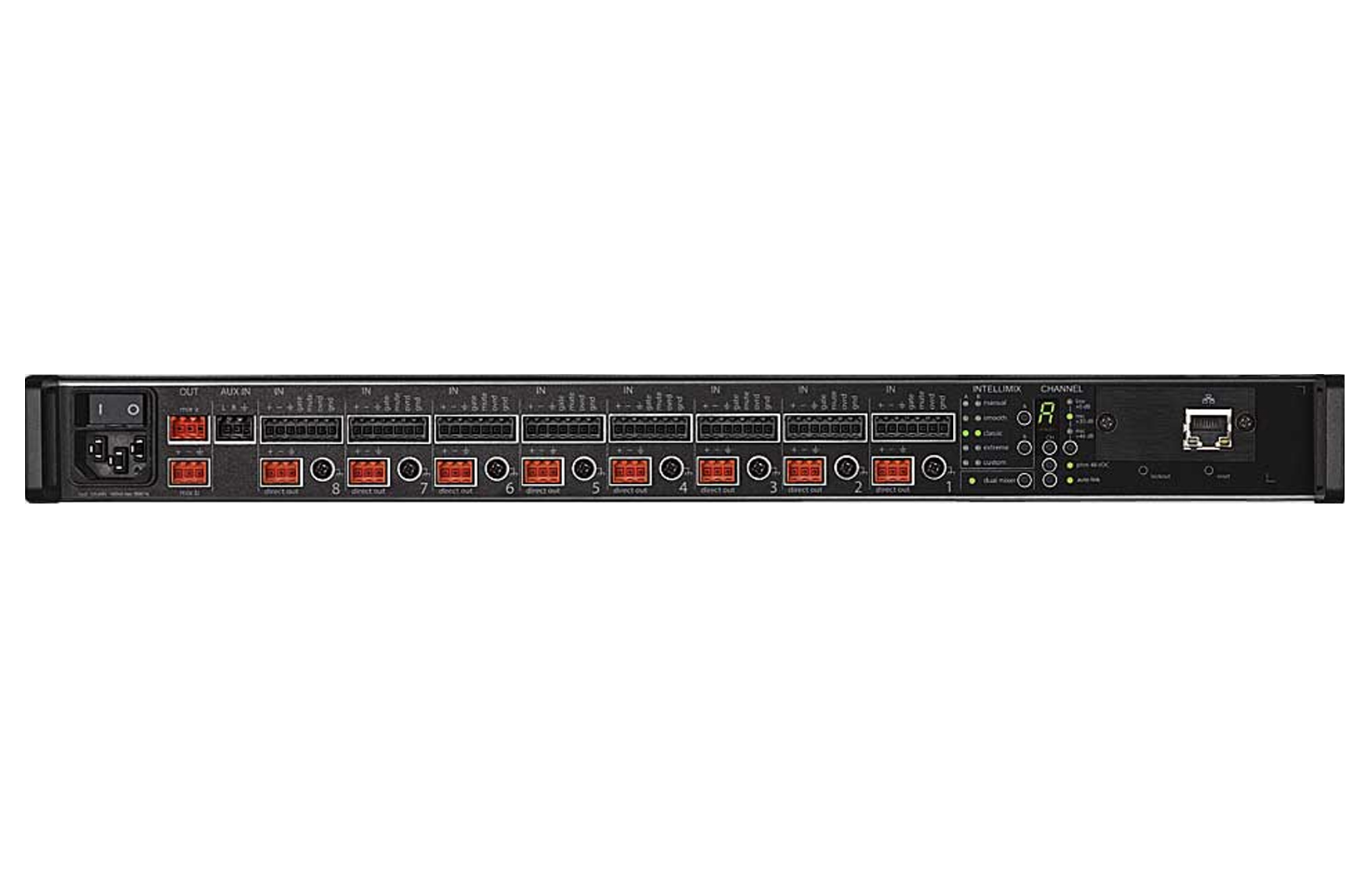 Mezcladora digital automática, 8 canales de MIC/LINE, Phantom Power +48V y tecnología Intelimix (3 modos seleccionables por el usuario). Adicional, cuenta con 1 entrada auxiliar en 3.5mm, 8 salidas directas y 2 salidas principales (configurables como espejo o independientes). El conector de las entradas/salidas es en euroblock (Phoenix). Capacidad de expansión con una tarjeta Dante (A820-NIC-DANTE). Cuenta con entradas/salidas lógicas para programar accionamientos automáticos y controles externos.