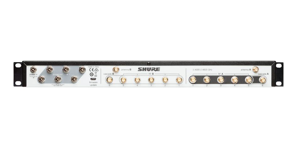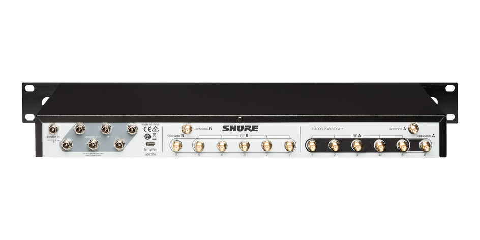 El gestor de frecuencias UA846Z2 para GLX-D Advanced permite conectar hasta seis receptores GLXD4R y ofrece un rendimiento de RF superior utilizando una comunicación de datos patentada. Se puede incrementar el número de canales del sistema inalámbrico digital GLX-D de montaje en rack a 9 sistemas simultáneos en aplicaciones típicas (11 en condiciones óptimas) gracias a las flexibles opciones de distribución de antenas en instalaciones multisistema.