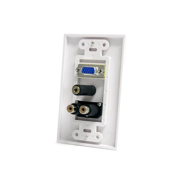 La placa de pared VGA Hembra, modelo VGAPLATERCA, incluye conectores RCA y de 3.5mm de audio, posibilitando un punto de conexión que facilita el enlace entre una computadora con salida VGA y un proyector o pantalla remota VGA.
